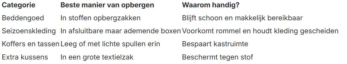 De grootste valkuil is dat je de ruimte helemaal vol stopt. Omdat je spullen niet ziet, lijkt het alsof alles netjes is. Maar zodra je iets nodig hebt, moet je graven. Dat is niet handig. Bewaar liever alleen spullen die logisch bij de slaapkamer horen of die je echt ergens kwijt moet.